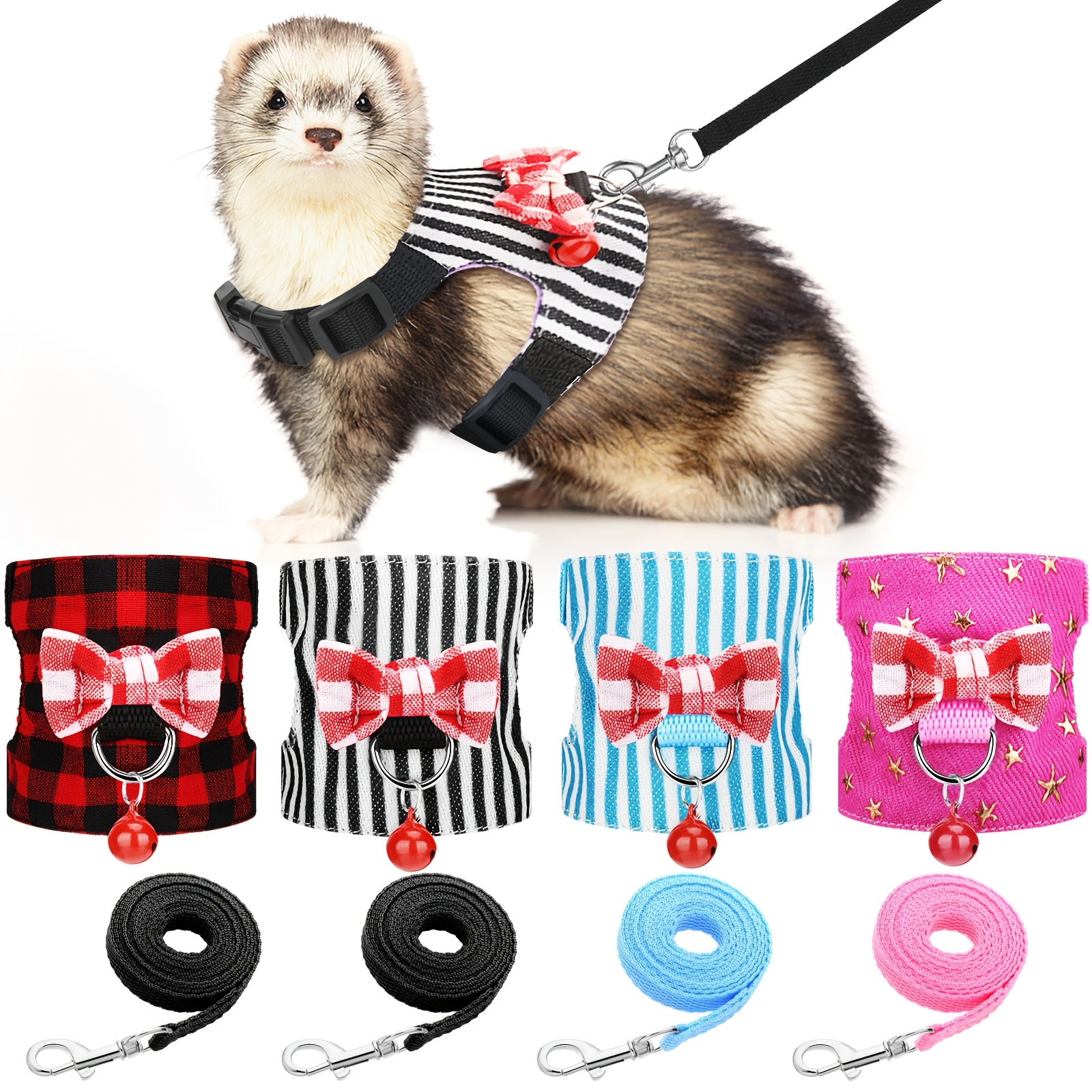 4pcs Small Pet Harness Vest and Leash Set with Cute Bowknot and Safe Bell Decor Chest Strap Harness for Outdoor Walking Rabbit Ferret Guinea Pig Bunny Hamster Puppy Kitten (Small)