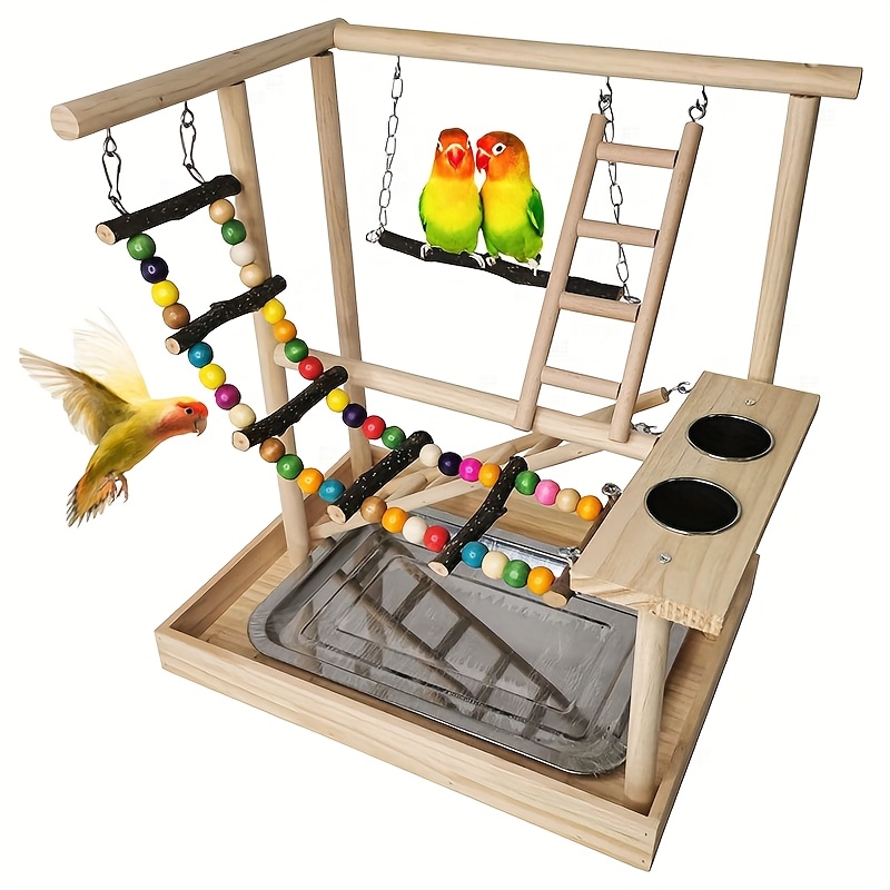 Deluxe Wooden Parrot Playstand with Climbing Ladder, Swing & Chew Toys - Includes Feeding Cups - Ideal for Small to Medium Birds like Parakeets, Conures & Lovebirds - Sturdy, Safe & Durable Exercise Center, Bird Toys