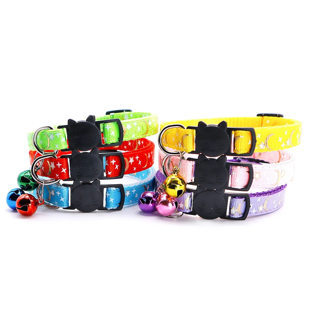 Gold Stars and Moon Cat Collar with Reflective Safety Buckle and Bell Adjustable Cats And Small Dogs Collars