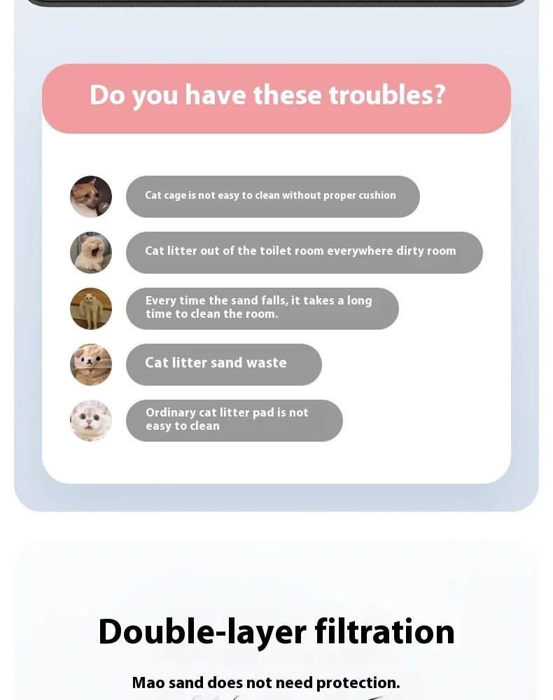 El cojín es ideal para recoger la arena de gato y para las delicadas garras. Nuestro suave material EVA es muy delicado con las sensibles garras de los gatos. A los gatos incluso les encanta pisarlo o echarse una siesta por la tarde. Su diseño de doble capa filtra la arena y la recoge en el fondo. Agítelo suavemente para liberarla.