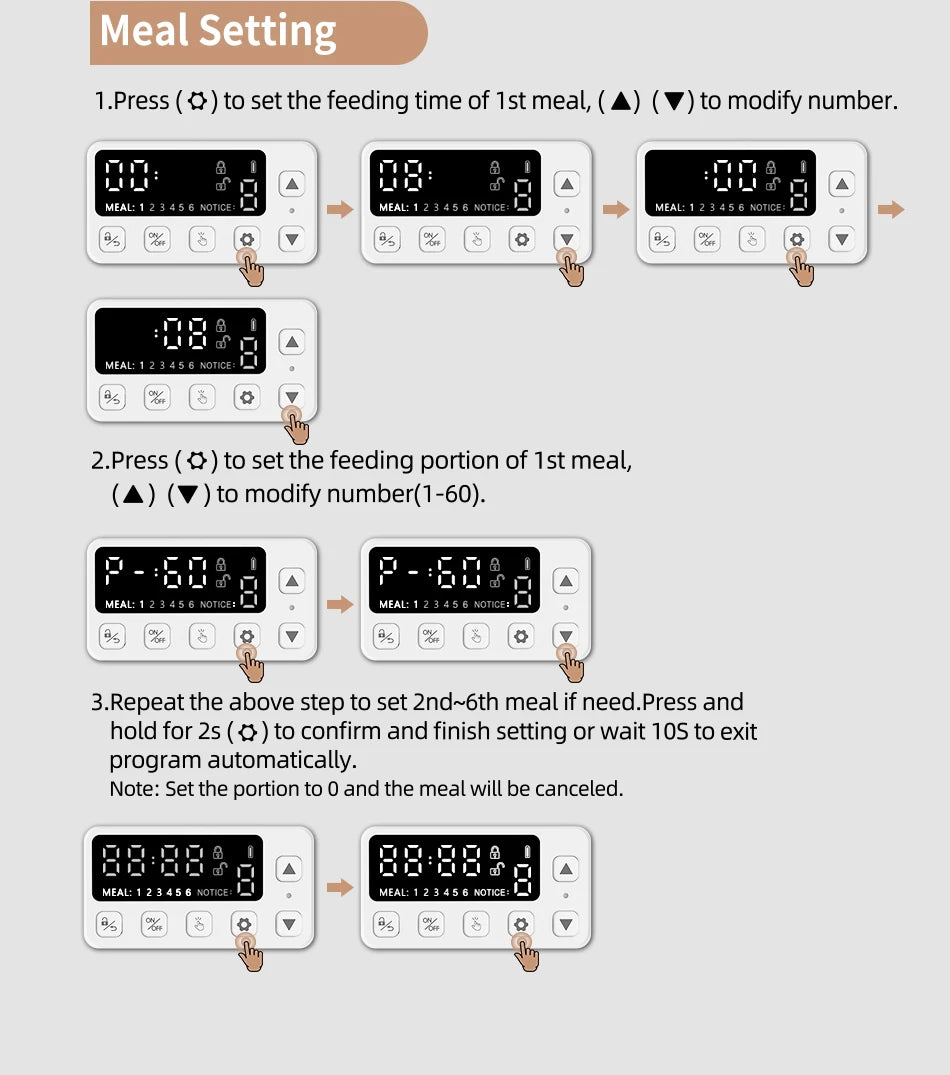 WiFi Version: can set 10 meals per day, up to60 portions per meal, 6±2g per portion.