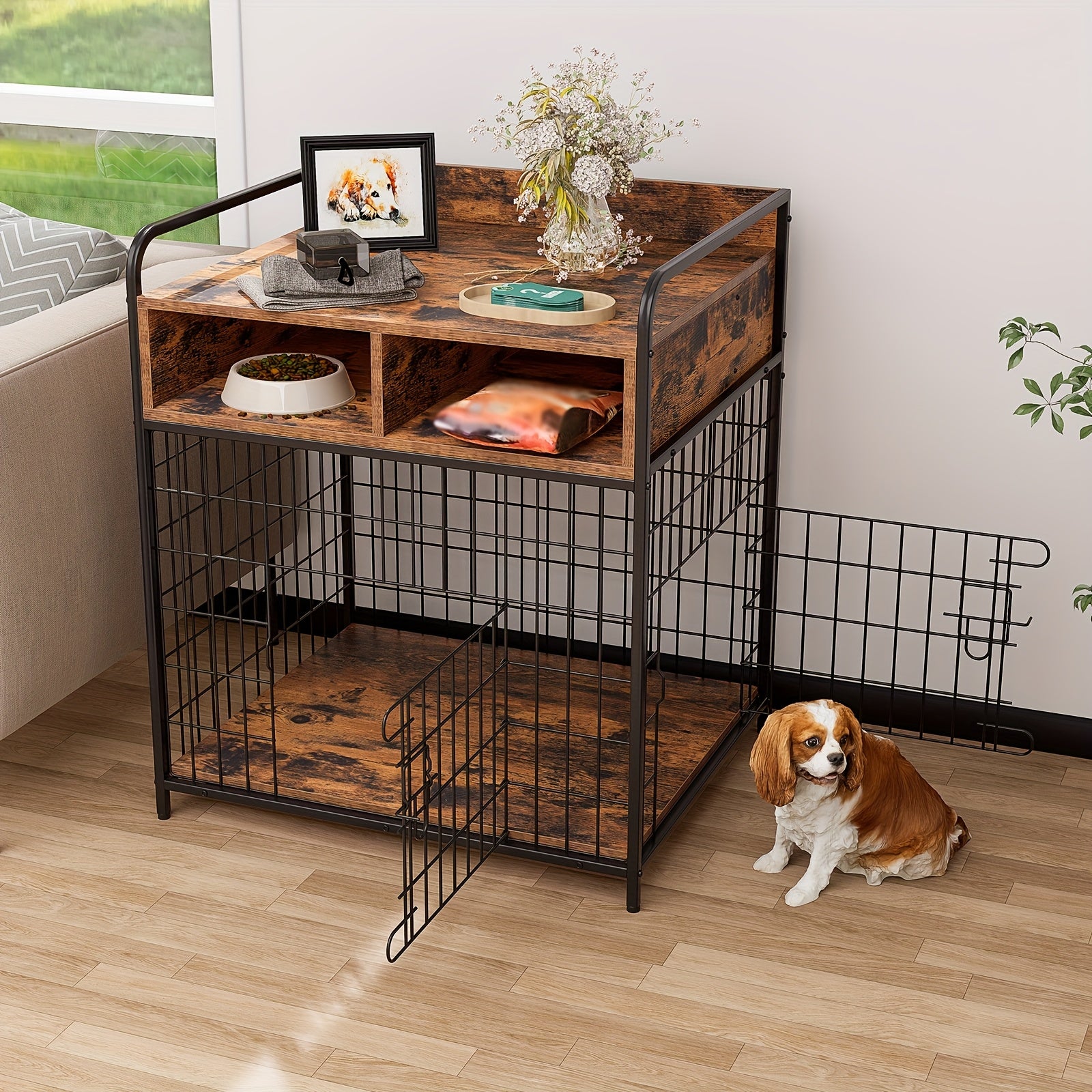 【Considerate Designs】①The Dog Crate features a dual-opening front door and a side door that opens singly, allowing for better adaptability to various furniture arrangements. ②The countertop's guardrail design prevents items from easily falling off. ③The rounded corners of the guardrail ensure user safety by minimizing the risk of injury from accidental bumps.