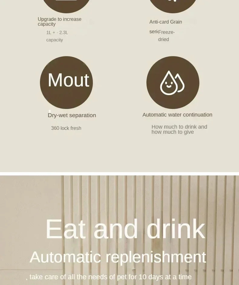 1.Non-electric automatic design:Using the mechanical automatic principle, no power supply or battery is required, and food and water are automatically distributed through the gravity principle, which is easy to use and reduces the additional power demand.